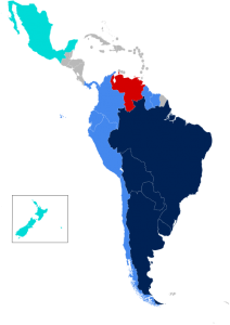 Los países del Mercosur en azul oscuro son miembros de pleno derecho. Rojo: miembros suspendidos. Azul: miembros asociados. Cian: observadores. (Mapa de Chase1493 vía Wikipedia)