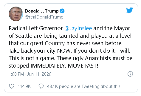Sean Hannity criticó al gob. de Washington Jay Inslee el jueves por permitir que los manifestantes se tomaradn crítica …” comenzó Hannity. “Miremos lo que está pasando en Seattle. Es tan malo que un extraño grupo de estos flojamente afiliados anarquistas y otros perdedores se han tomado literalmente seis cuadras de la ciudad en uno de los más prominentes barrios de Seattle.