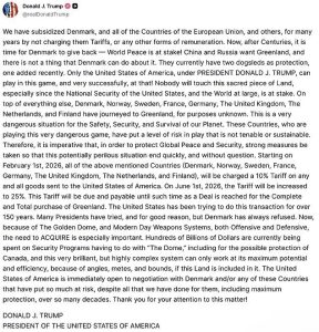 Un lector me envió lo siguiente de Truth Social de Donald Trump sobre nuevos aranceles contra las naciones europeas que no apoyan sus planes para Groenlandia: