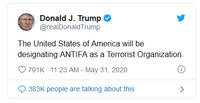 El presidente Donald Trump tuiteó que estaba designando a Antifa como una organización terrorista.