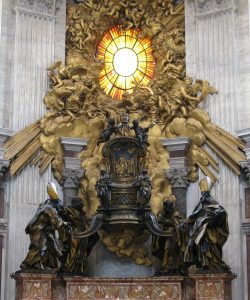 De joven, Gianlorenzo Bernini (1598–1680) visitó San Pedro con el pintor Annibale Carracci y manifestó su deseo de construir “un poderoso trono para el apóstol”. Su deseo se hizo realidad. Cuando era joven, en 1626, recibió el patrocinio del Papa Urbano VIII y trabajó en el embellecimiento de la Basílica durante 50 años … Bernini luego dirigió su atención a otra reliquia preciosa, la llamada Cátedra Petri o “trono de San Pedro”, una silla que a menudo se afirmaba que había sido utilizada por el apóstol, pero parece que data del siglo XII. Como la silla en sí se estaba deteriorando rápidamente y ya no era útil, el Papa Alejandro VII decidió consagrarla con el esplendor adecuado como el objeto en el que se basaba la línea de sucesores de Pedro. Bernini creó un gran trono de bronce en el que se alojaba, elevado sobre cuatro soportes en bucle sostenidos sin esfuerzo por enormes estatuas de bronce de cuatro doctores de la Iglesia, San Ambrosio y Agustín que representan a la Iglesia latina y Atanasio y Juan Crisóstomo, la Iglesia griega. Las cuatro figuras son dinámicas con túnicas amplias y expresiones de adoración y éxtasis. (Basílica de San Pedro. Wikipedia , visto 21/07/12)