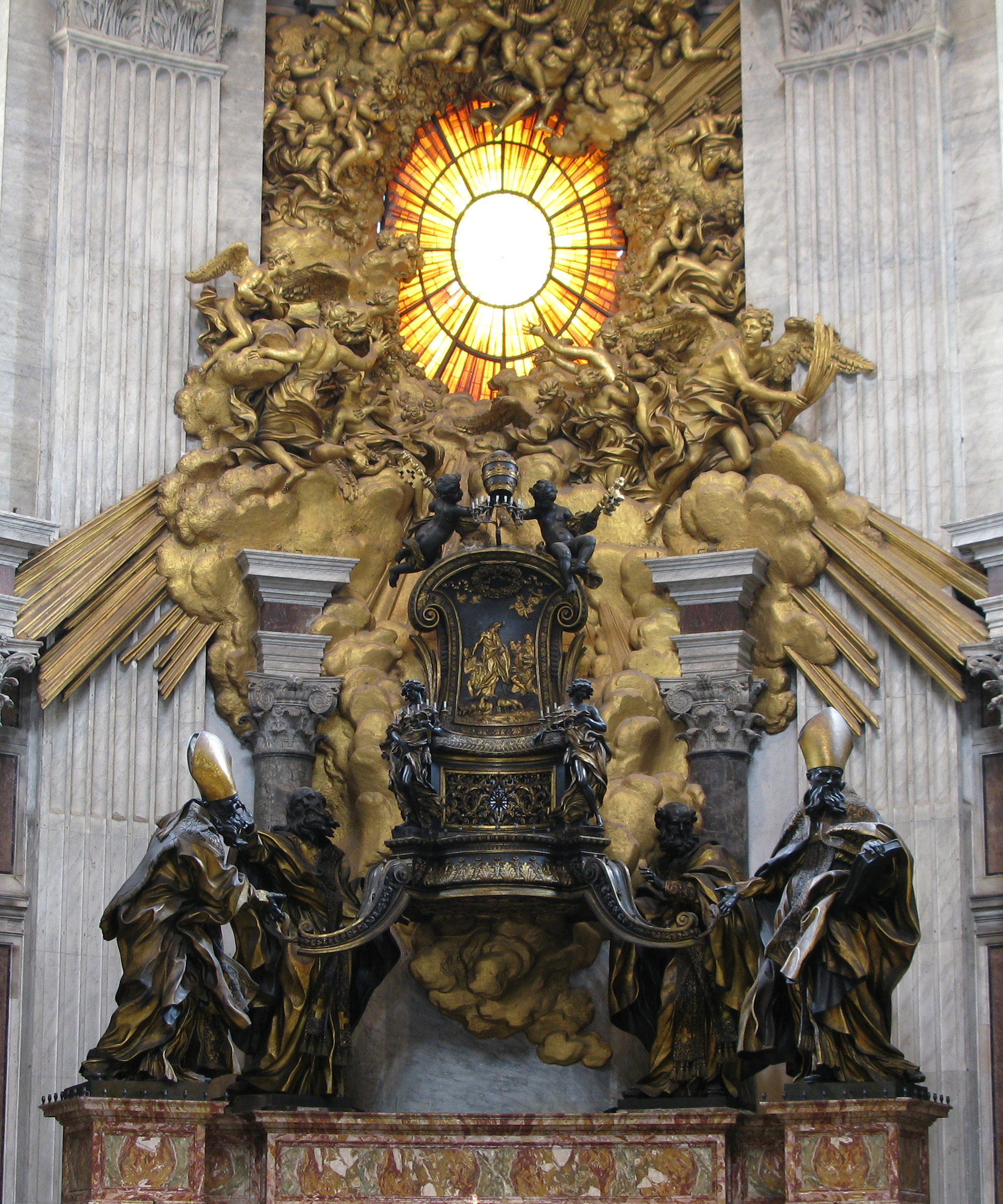 De joven, Gianlorenzo Bernini (1598–1680) visitó San Pedro con el pintor Annibale Carracci y manifestó su deseo de construir “un poderoso trono para el apóstol”. Su deseo se hizo realidad. Cuando era joven, en 1626, recibió el patrocinio del Papa Urbano VIII y trabajó en el embellecimiento de la Basílica durante 50 años … Bernini luego dirigió su atención a otra reliquia preciosa, la llamada Cátedra Petri o “trono de San Pedro”, una silla que a menudo se afirmaba que había sido utilizada por el apóstol, pero parece que data del siglo XII. Como la silla en sí se estaba deteriorando rápidamente y ya no era útil, el Papa Alejandro VII decidió consagrarla con el esplendor adecuado como el objeto en el que se basaba la línea de sucesores de Pedro. Bernini creó un gran trono de bronce en el que se alojaba, elevado sobre cuatro soportes en bucle sostenidos sin esfuerzo por enormes estatuas de bronce de cuatro doctores de la Iglesia, San Ambrosio y Agustín que representan a la Iglesia latina y Atanasio y Juan Crisóstomo, la Iglesia griega. Las cuatro figuras son dinámicas con túnicas amplias y expresiones de adoración y éxtasis. (Basílica de San Pedro. Wikipedia , visto 21/07/12)