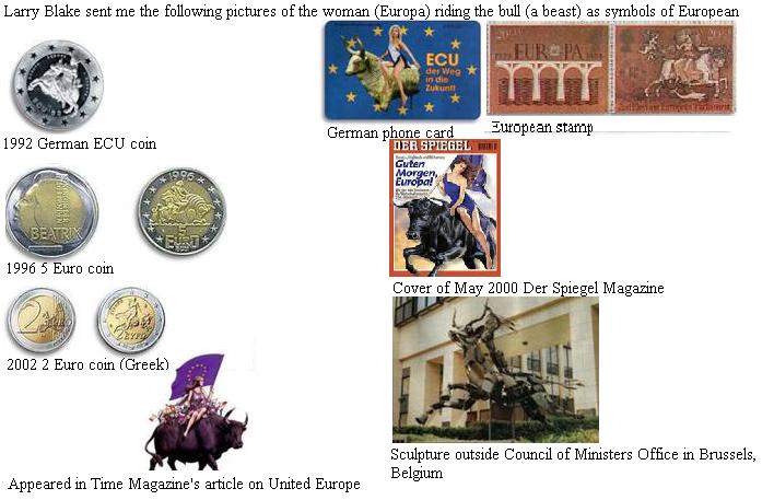 En lo que respecta a Europa, según la mitología, lleva el nombre de una ninfa que fue seducida por Zeus para montarlo cuando era un toro. Al comienzo de este correo hay varias representaciones de la mujer Europa montada en la bestia. Los observadores de las profecías a menudo se dan cuenta de que esto es similar al siguiente del Nuevo Testamento: