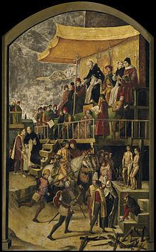 Representación artística del santo Católico Dominico presidiendo la quema de dos personas en la hoguera