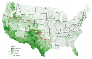 Ahora, observe la población hispana en los EE. UU. según los datos de Yerevanci, con la línea roja que muestra los antiguos territorios mexicanos:
