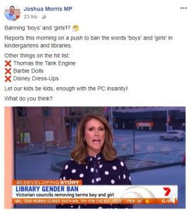 La foto de Facebook al comienzo de este correo está relacionada con algo que salió el año pasado en Australia en donde un distrito escolar estaba indisponiendo a los padres a causa de su esperanza de minimizar los estándares bíblicos para el género (ver también Autoridades Locales australianas y de los EE.UU. desean ‘minimizar’ la verdad de género http://www.cogwriter.com/news/doctrine/local-australian-and-usa-authorities-want-to-minimize-gender-truth/).