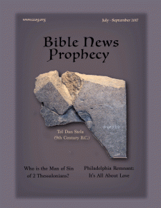 Nótese la portada de la edición de julio-septiembre de 2017 de la revista Bible News Prophecy: